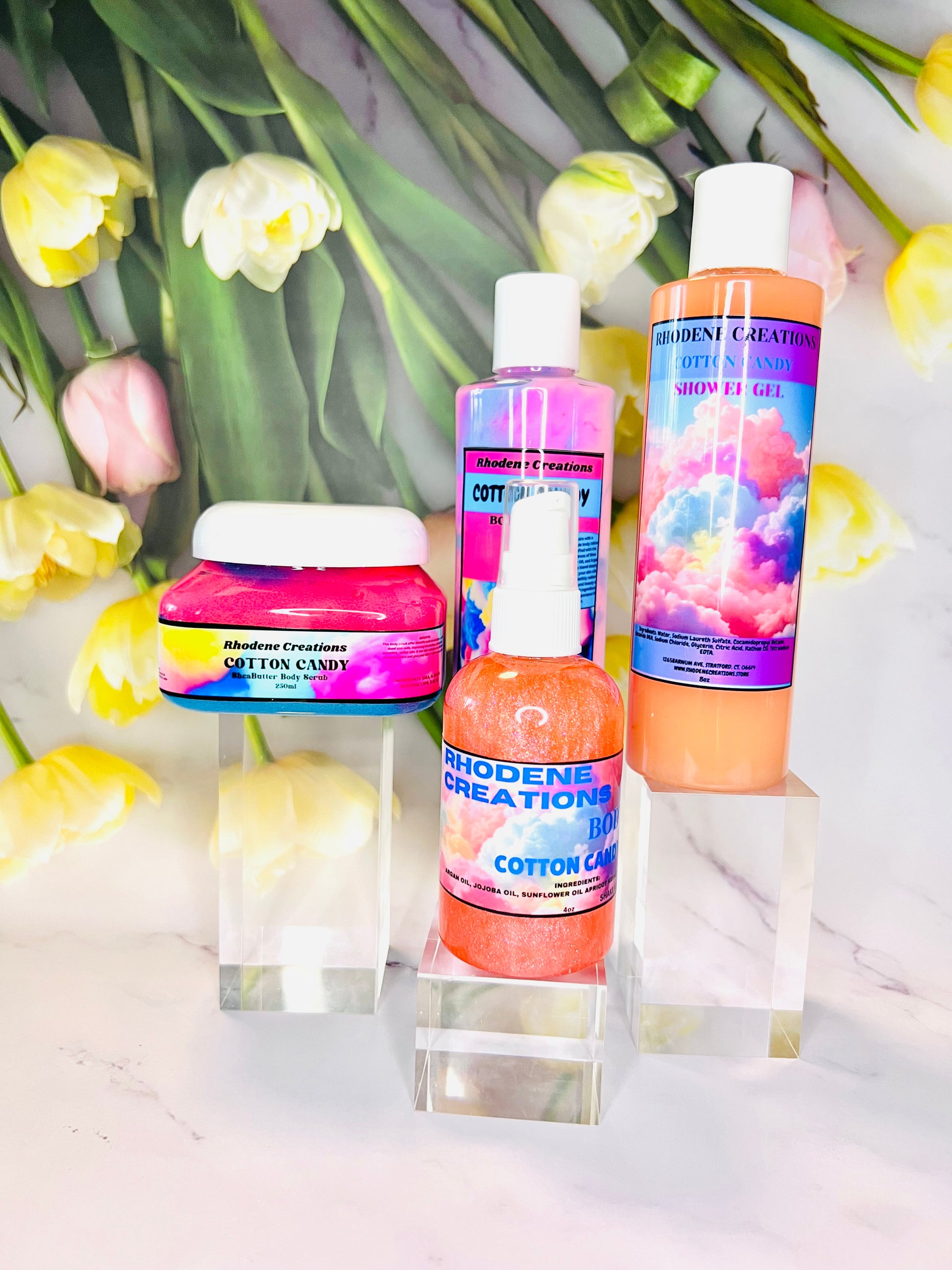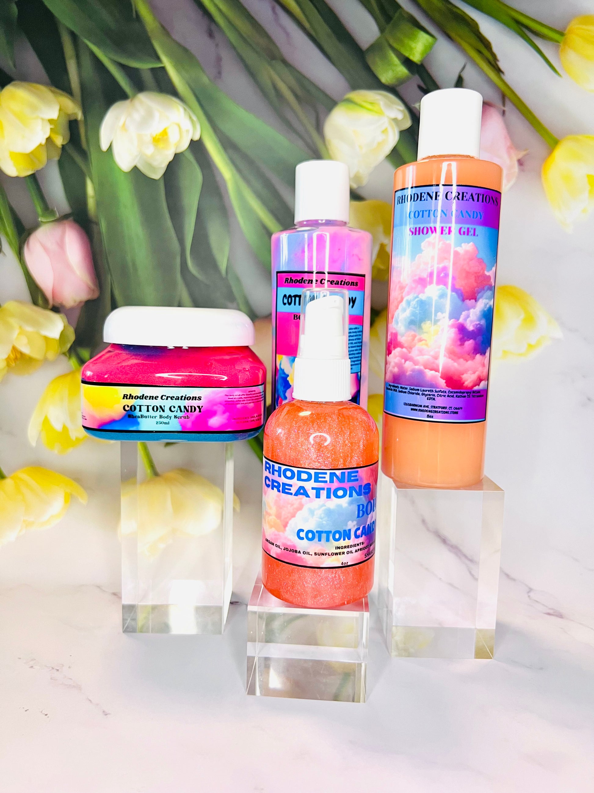 Indulge in a luxurious spa experience with our Cotton Candy Bundle. This set includes a body lotion, body scrub, body oil, and shower gel, all infused with the sweet scent of cotton candy. Treat yourself to soft, nourished skin with our all-natural, moisturizing products.