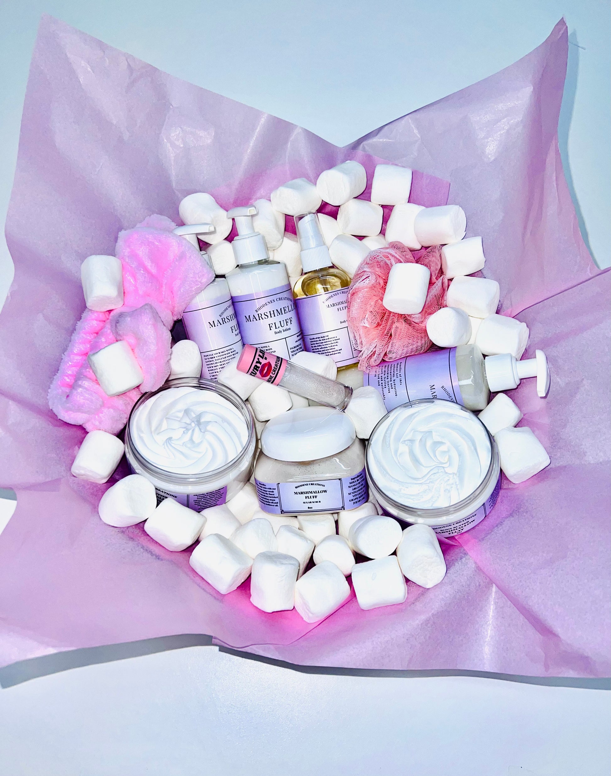 Pamper yourself with our Marshmallow Fluff Bundle. This spa set includes a sparkling lip gloss, shower gel, body butter, bath butter, body lotion, mini body lotion, body scrub, and body oil. Indulge in a sweet aroma, just like marshmallow fluff.