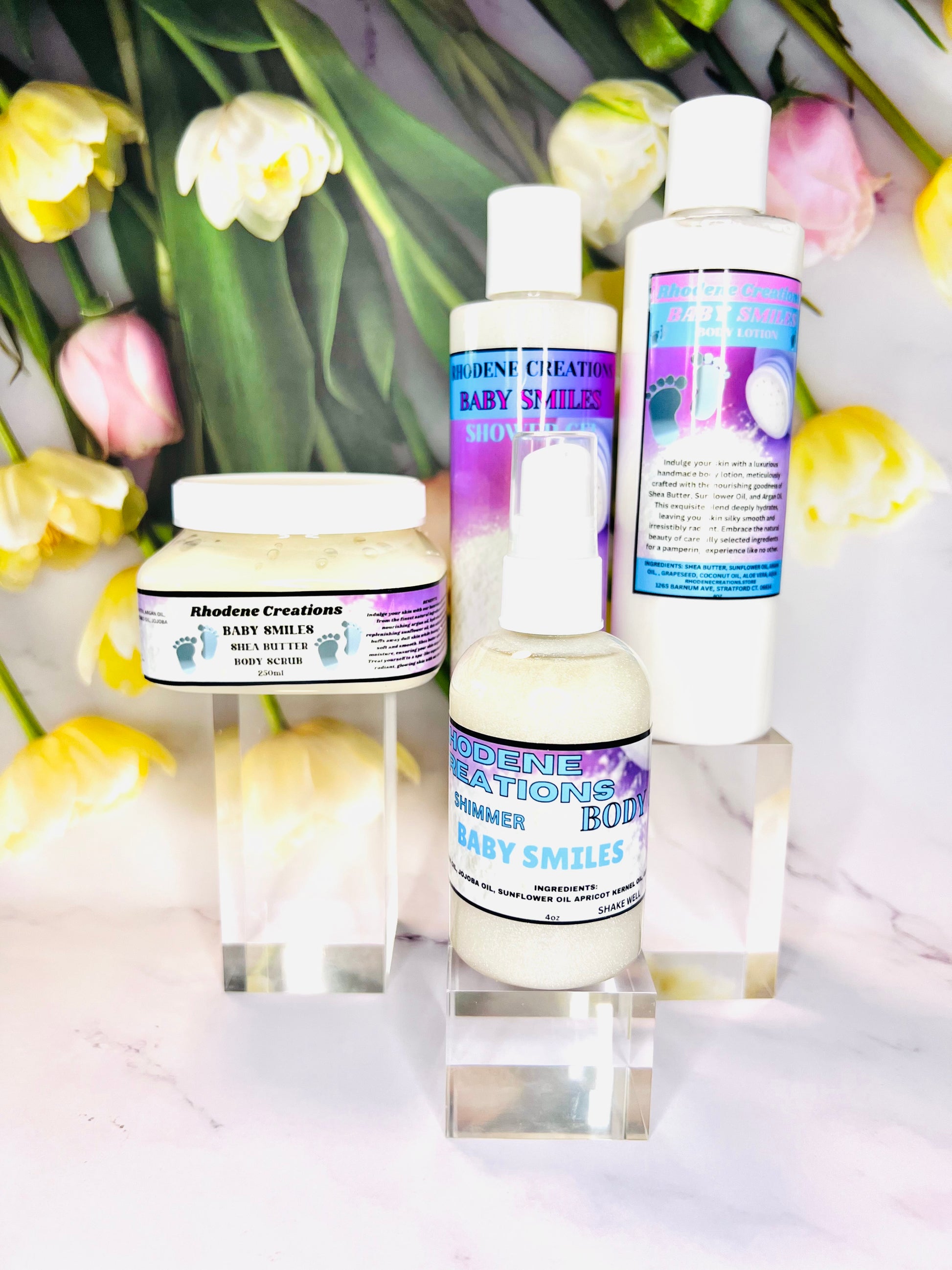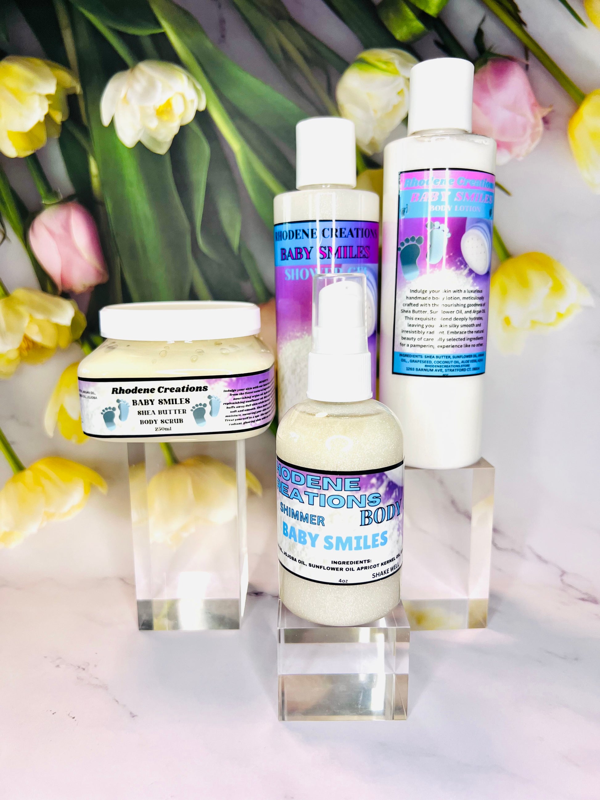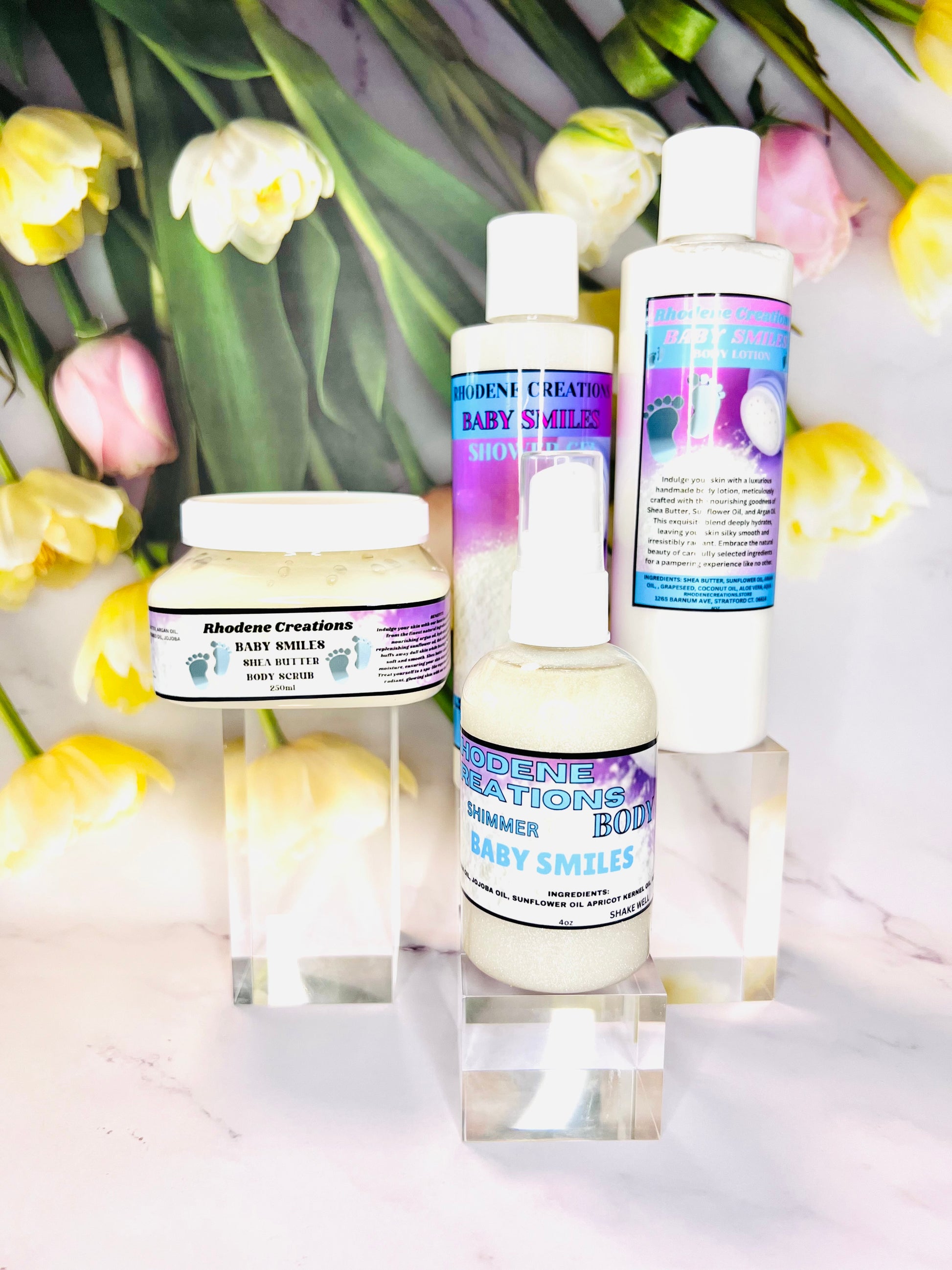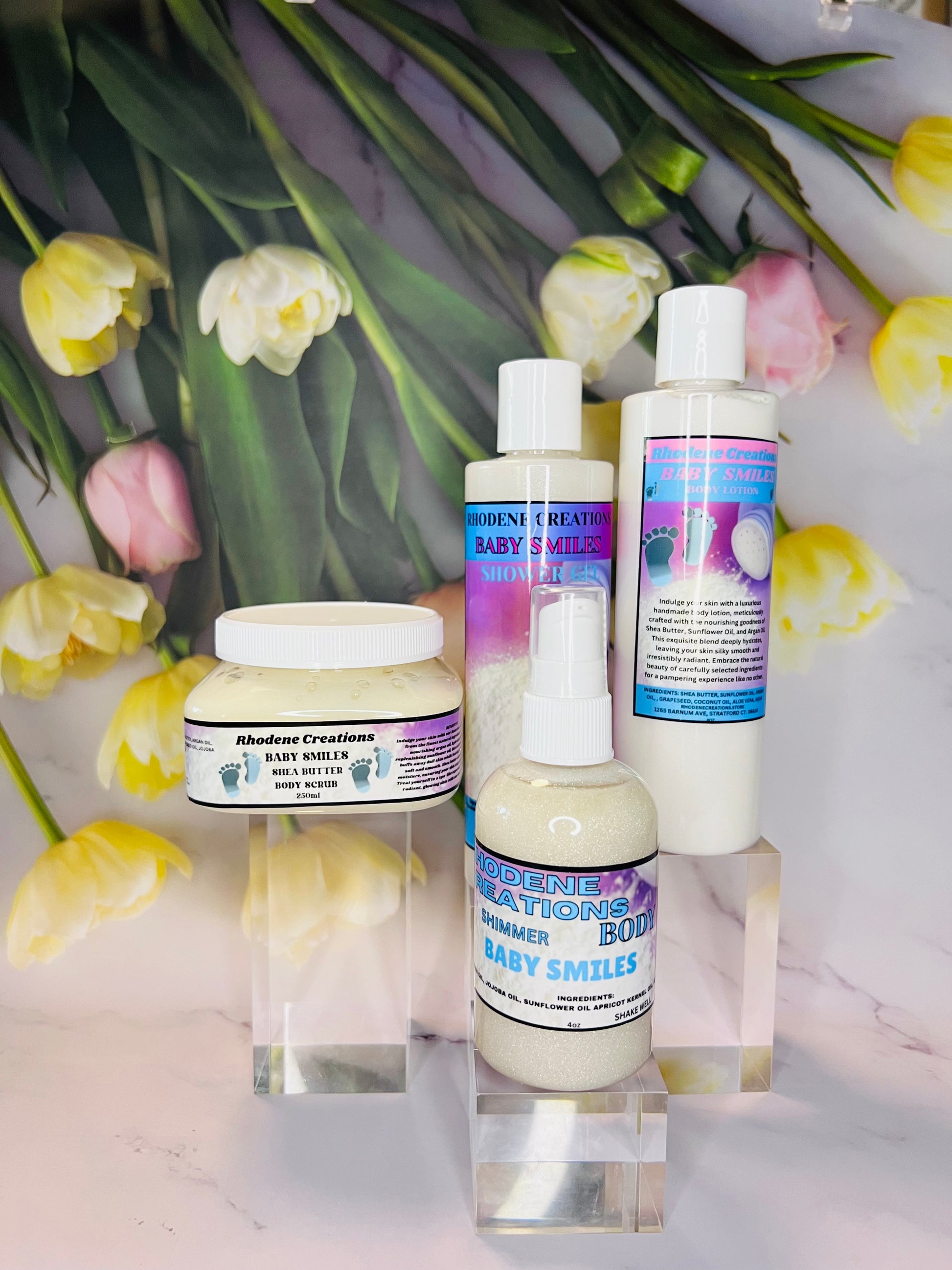 Experience the ultimate in baby soft skin with our Baby Smiles Bundle. This spa set features a gentle baby powder scent and includes body lotion, body scrub, body oil, and shower gel. Keep your little one's skin soft and nourished with this luxurious bundle.
