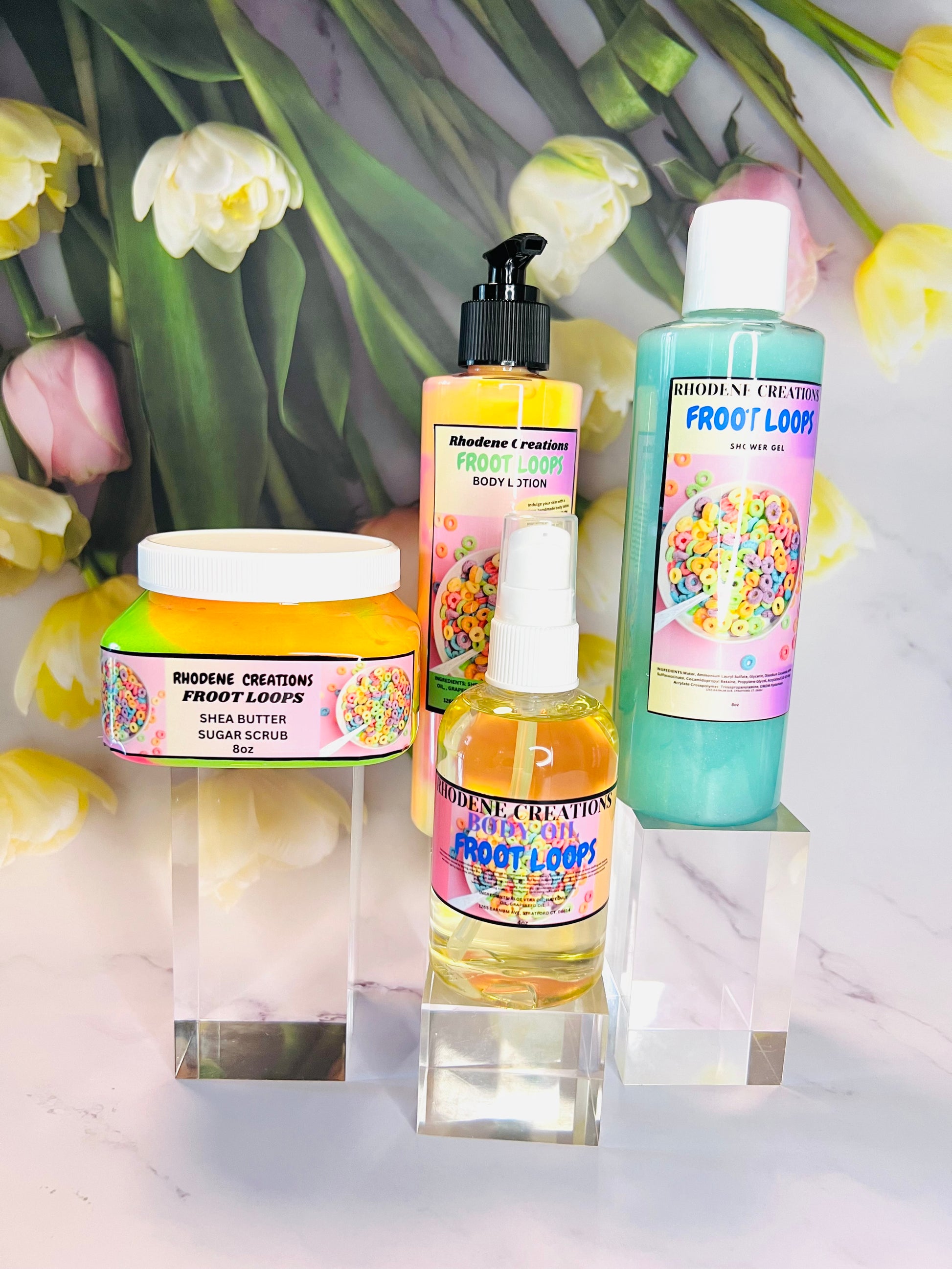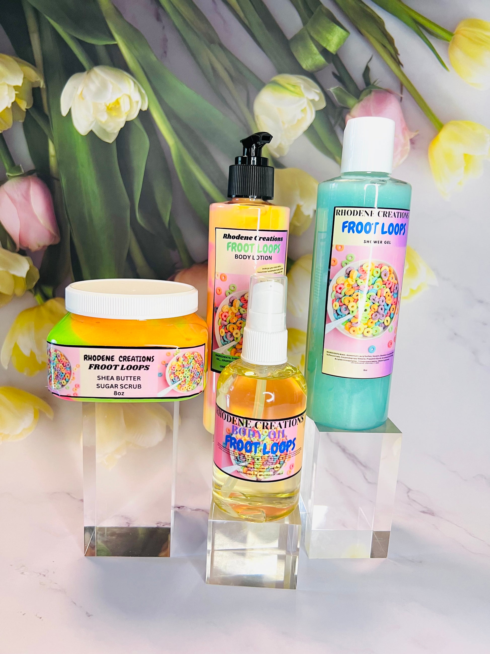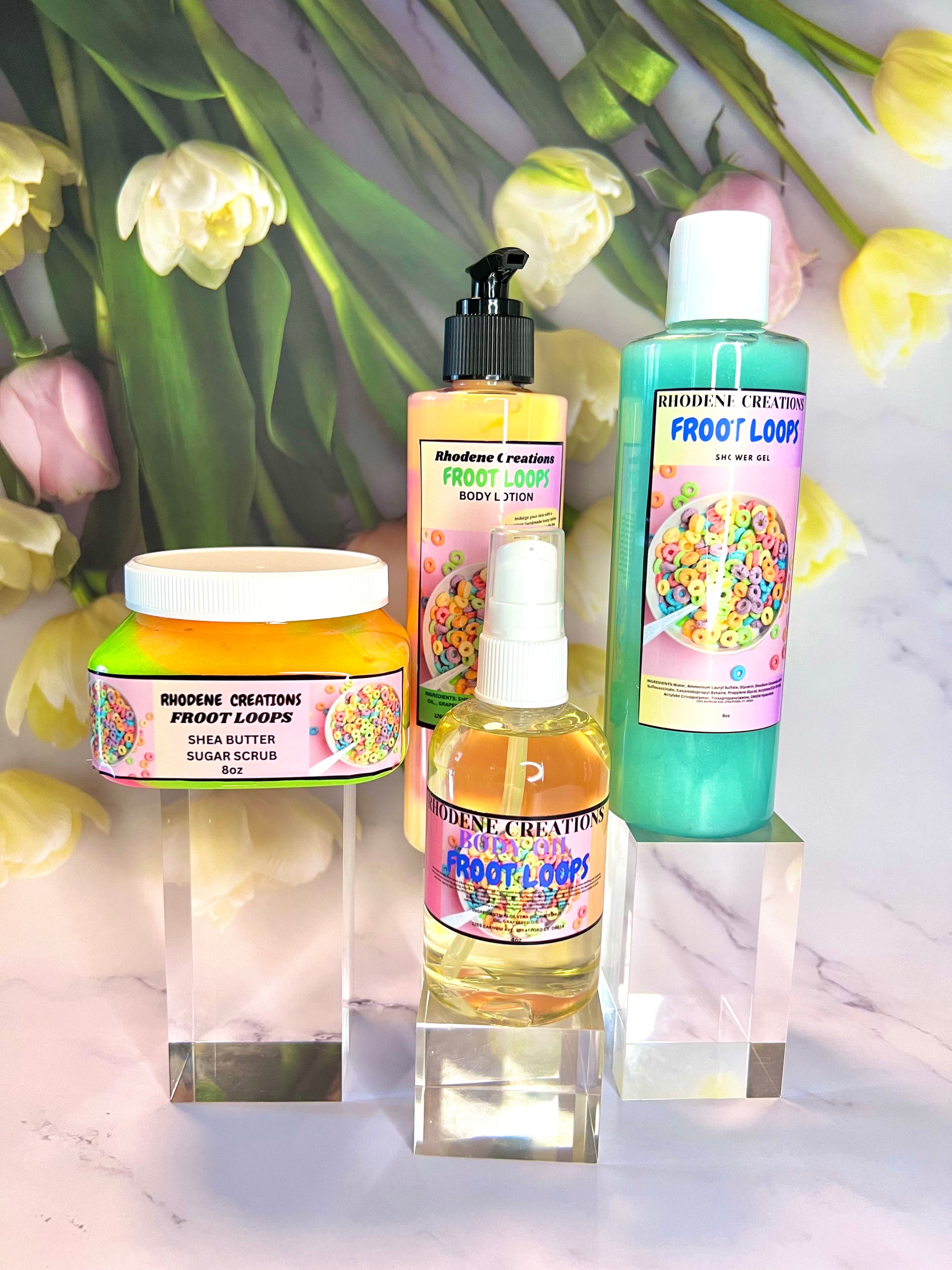 Enhance your daily self-care routine with our Froot Loops Bundle. This spa set includes a nourishing body lotion, exfoliating body scrub, hydrating body oil, and refreshing shower gel. Made with natural ingredients, this bundle will leave your skin feeling soft and rejuvenated. Indulge in the benefits of these luxurious products for a spa-like experience at home.