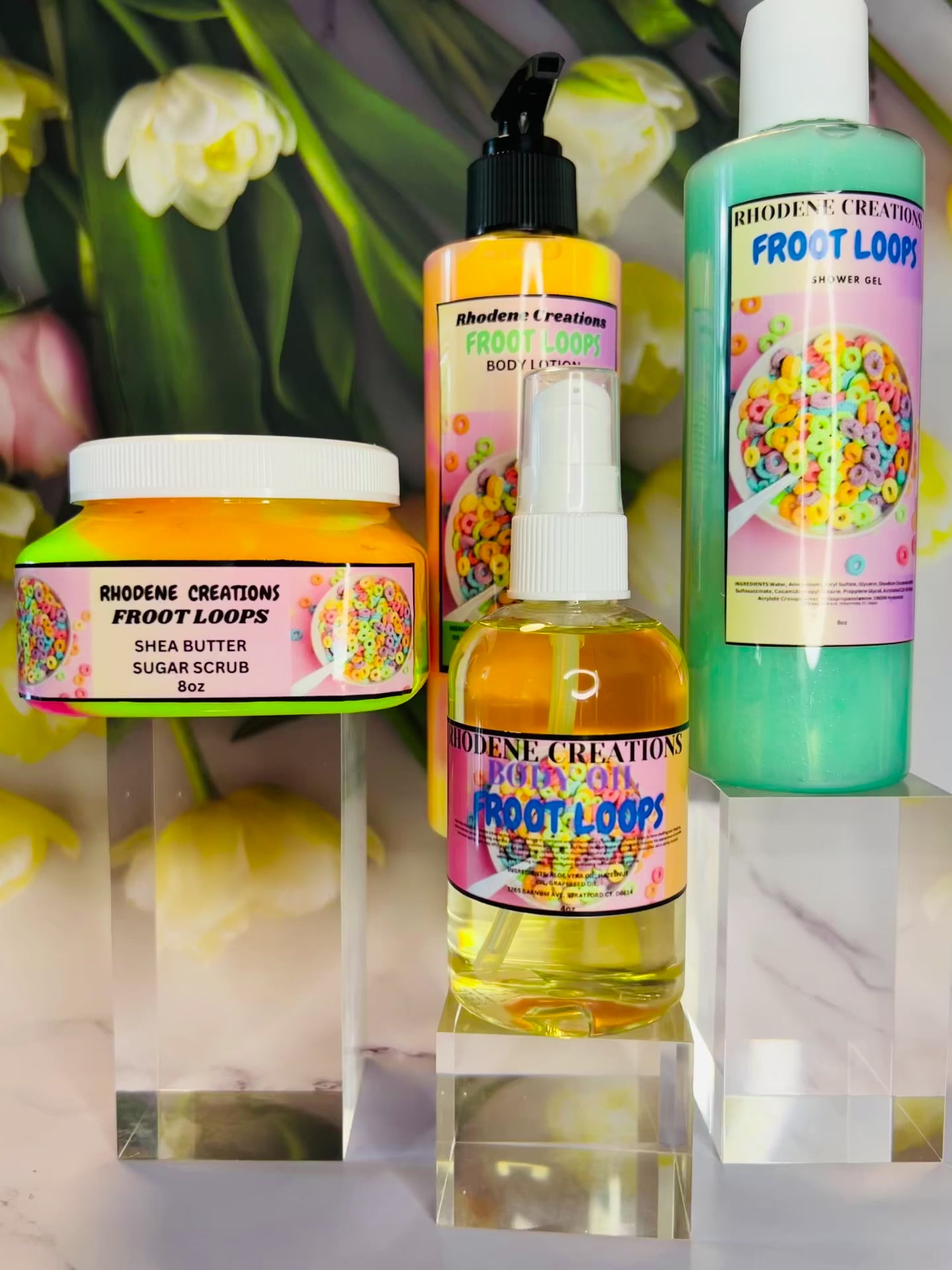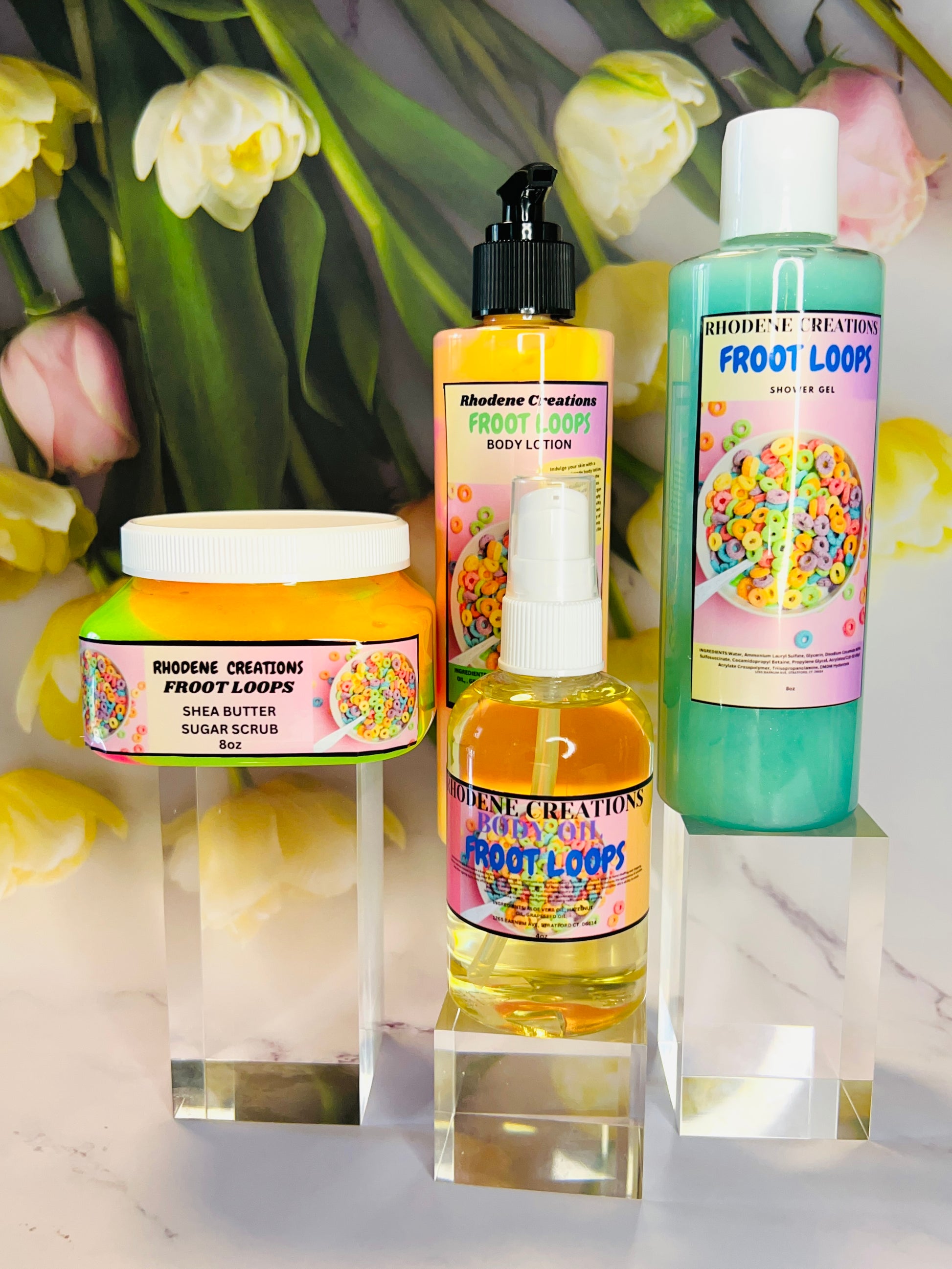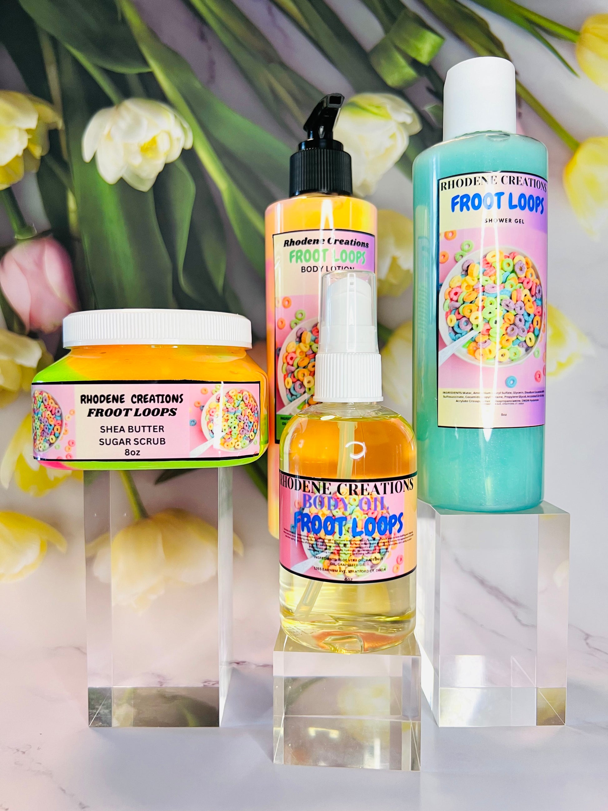 Enhance your daily self-care routine with our Froot Loops Bundle. This spa set includes a nourishing body lotion, exfoliating body scrub, hydrating body oil, and refreshing shower gel. Made with natural ingredients, this bundle will leave your skin feeling soft and rejuvenated. Indulge in the benefits of these luxurious products for a spa-like experience at home.